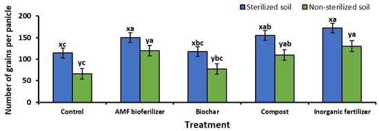 Mean values of the number of grains per panicle at 9 weeks after sowing the rice seeds according to different fertilizer applications and soil types. Different letters mentioned in the columns indicate significant differences at the level of 0.05. Values are means ± standard errors. x/y indicates the significant difference in soil type and a–c indicates the significant difference in fertilizer treatments (Tukey pairwise comparison).