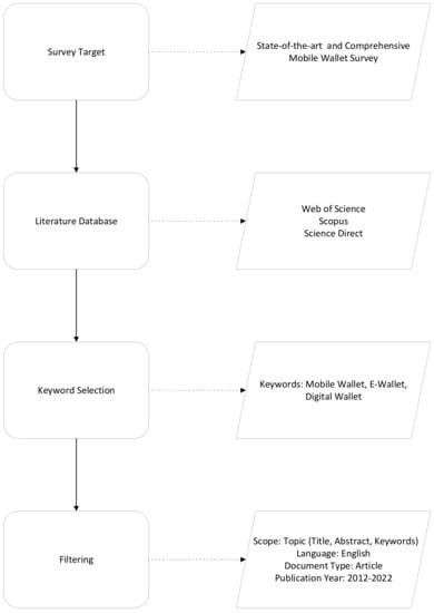 The survey target for this article originates from state-of-the-art mobile wallet technology usage. Figure 1 demonstrates the survey method of this article. Firstly, scientific databases hosting articles related to the research context have been clarified. The survey was conducted using the Scopus, Web of Science, and Science Direct databases. Publications were restricted with a clear filtering policy and must meet the requirements. Thus, each publication must be in an article format written in English, be published in a peer-reviewed academic journal, have the full text available, and be published between 2012 and 2022. The search scope was the ‘topic’ (article title, abstract, and keywords). Keyword selection was not limited to the mobile wallet. Comprehensive research shows that digital wallets and electronic wallets (e-wallets) are based on mobile devices that refer to the same technology in the literature as well [,,,]. It is for this reason that the keywords used for the search are ‘mobile wallet’, ‘digital wallet’, and ‘e-wallet’.