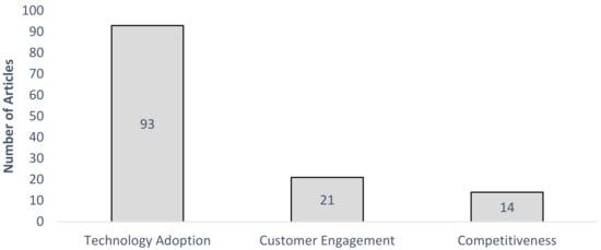 Observing how cutting-edge and eco-friendly services such as mobile wallets evolve to be and examining the development phases contribute to the understanding of how this service improves sustainability. After conducting a literature review on multiple aspects of mobile wallets, we discovered that mobile wallets are responsible for not only usefulness and enjoyment but also sustainability. When analyzing the different aspects of mobile wallets, we noted that this service evolves to the need of the customers and merchants. In the literature, it was possible to observe that the analyzed documents fit into three groups to understand how mobile wallets improve sustainability in payment services and analyze the research scope. Figure 4 illustrates the research topics in the period of 2012–2022. The technology adoption of mobile wallets is the leading research topic in the literature. In the field of adoption, researchers seek to find an answer to research questions such as how customers increase to use of mobile wallets and which factors affect mobile wallet usage. Technology adoption includes determinants of intention to use a mobile wallet, pre- and post-acceptance dynamics, and factors influencing customer attitudes. Customer engagement is the second most prominent research topic, with 21 papers combining satisfaction, customer loyalty, and campaign/promotion management-related research for mobile wallets. Competitiveness is the third research topic, with 14 articles that comprise innovation and service quality-related research.