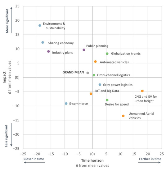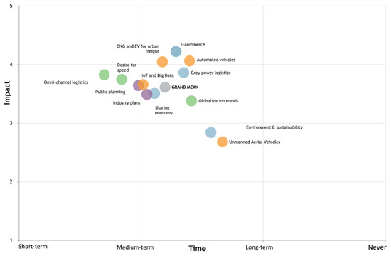Urban logistics drivers’ impact and time positioning (grand mean and mean values).