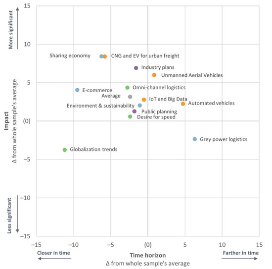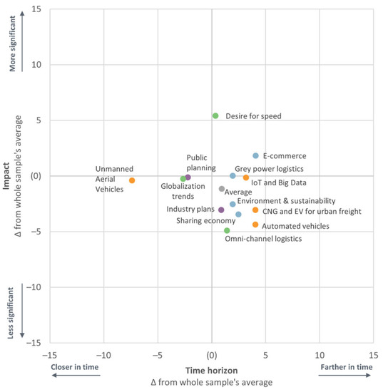 The majority of the deviations related to business sector presented in Figure 2 are located in the upper left quadrant of the diagram. In particular for “Sharing economy” “CNG and EV vehicles”, “Industry plans”, “Omni-channel logistics” and “E-commerce” are expected to have a greater impact in expected in narrower time frame.