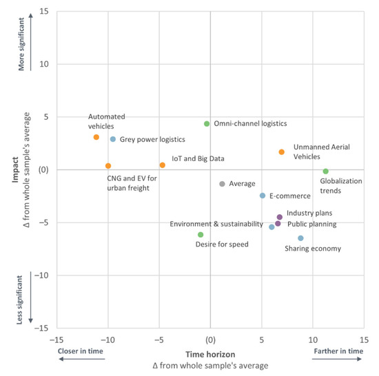 Additionally, in this case, percentage deviations of the individual drivers from the grand mean were analyzed. Time horizon that is at least 10% below the average (short-term impact) is related to two drivers: “Omni-channel logistics” and “Desire for speed”. A deviation that is at least 10% above the average (medium- to long-term impact) is related to: “Environment and sustainability”, and “Unmanned Aerial Vehicles”.