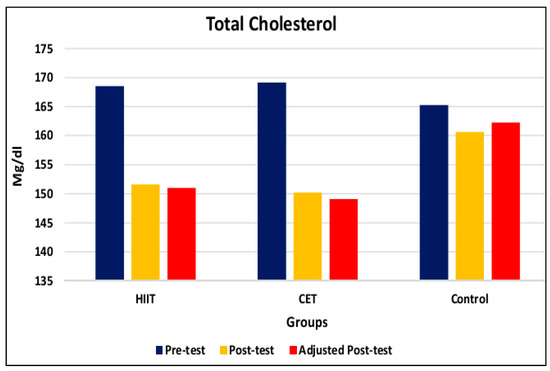 In Figure 1 the mean difference of pre-test, post-test and adjusted post-test of HIIT, C.E.T. and control group on total cholesterol is graphically displayed.