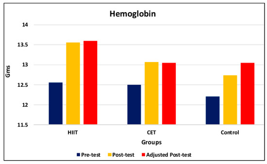 In Figure 3 shows the mean difference of pre-test, post-test, and adjusted post-test of HIIT, C.E.T., and control group on hemoglobin is graphically displayed.