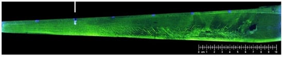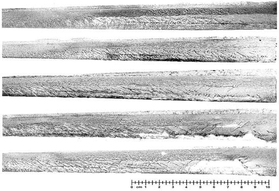 Magnetic particle inspection uses the interaction between the leakage magnetic field at the workpiece defect and the magnetic powder. It uses the difference between the magnetic permeability of the surface and near-surface defects (such as cracks, slags, hairlines, etc.) of steel products and the permeability of steel. After magnetization, the magnetic field at the discontinuity of the material will be distorted. It will generate a leakage magnetic field on the surface of the workpiece, where part of the magnetic flux leaks. Thereby attracting the magnetic powder to form the magnetic powder accumulation on the defect magnetic trace, which shows the position and shape of the defect under appropriate lighting conditions, to observe and interpret the accumulation of these magnetic particles and realize magnetic particle inspection. The time and location of severe cracks and breakages in rails (especially in the crossing area) are random. In this study, high-definition image shooting and magnetic particle inspection at fixed traffic intervals were performed on multiple crossing areas until the crossing’s complete rolling fatigue damage process was observed. The magnetic particle inspection image is obtained from the surface inspection of the crossing nose track, as shown in Figure 1.
