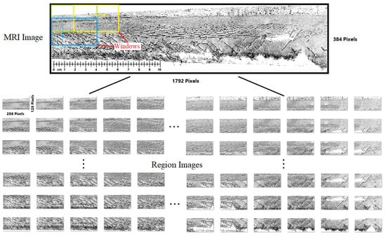 The resulting image was unified to 1792 × 384 pixels and divided the image into 256 × 128 local patches in the 64-pixels step. The size of the partial image is selected according to the principle that the image of this size can completely contain most of the surface cracks of the crossing nose track. The segmented image obtained by the above method retains all the texture features. With the code of images, the specific position of the crossing nose track surface where the crack is located can be located, which provides convenience for the subsequent return of results. Figure 3 shows the partially segmented image. Because of the geometry of the crossing nose track’s widening cross-section with distance from the vertex, some segmented images contain more blank parts. For the accuracy of the data, this part of the local image was removed.