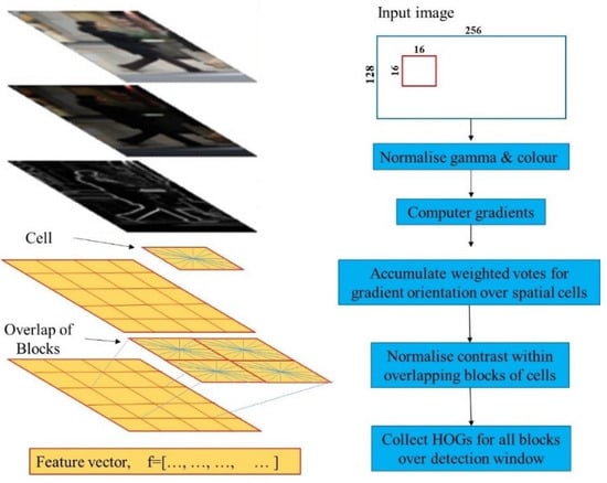 Histogram of Oriented Gradient (HOG) is a computational method that can be used to characterize the images. In computer vision detection, the detection target is locked by image processing [23]. Computing the gradient direction histogram of the local area of the image is a method for HOG to construct image features. The method of HOG feature analysis is typical in the field of image classification. HOG obtains the gradient feature of the image by calculating the size and direction of the gradient of each pixel in the image and is a feature descriptor. Due to the computation of local histograms and normalization, it is remarkably invariant to image geometric and optical deformations. Figure 4 shows the processing process.