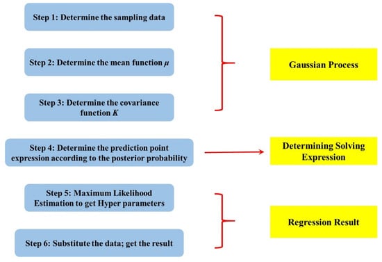 Gaussian process regression (GPR) models are nonparametric kernel-based probabilistic models with a finite collection of random variables with a multivariate distribution [30]. The Gaussian process has one more time or space dimension than the Gaussian distribution or one more prediction process. Figure 5 shows the steps of using Gaussian process regression prediction.