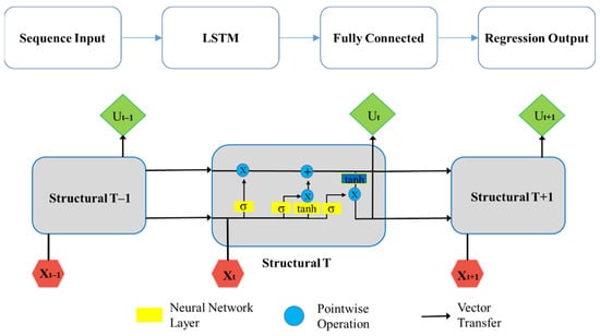 Nevertheless, the repeated modules of the LSTM have a unique structure, as shown in Figure 6. It comprises four neural structures that communicate information in particular ways. Figure 6 illustrates the architecture of a simple LSTM network for regression. The network starts with the sequence input layer and then the LSTM layer. Finally, a fully connected layer and a regression output layer are at the network’s end.
