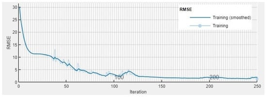 The input layer of the LSTM network in this chapter is 54 texture feature data, and the LSTM layer contains a total of 200 hidden units. At the end of the network is a fully connected layer. Finally, the regression result is output through the regression layer. During this period, the data needs to go through 250 rounds of training. Specify an initial learning rate of 0.005 and reduce the learning rate after 125 epochs by multiplying by a factor of 0.2. To prevent exploding gradients, the authors set the gradient threshold to 1. Figure 8 shows the training process of LSTM.