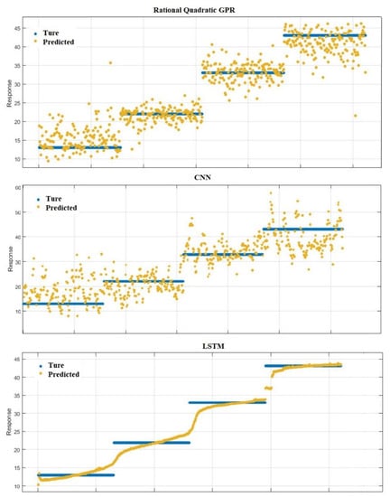 The RMSE value of LSTM keeps decreasing until it reaches a meager value. In contrast, CNN implements regression prediction. The input data is in the form of m × n. here m represents how many input features there are (54 features). n is how many samples (624 data samples). The output data is “one × n”, and 1 (one) represents the output is a single output. After the convolutional layer and the activation function are two fully connected layers with 384 neurons. The final regression layer outputs the regression results. As the optimal solution in supervised learning, GPR is compared with the regression model of CNN and LSTM. Figure 9 compares the scatter plots formed by the predicted values of the three models with the actual values.