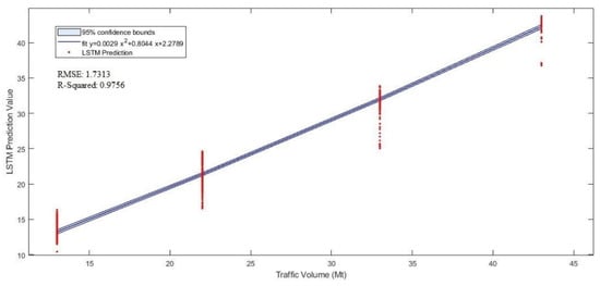 Figure 10 is the regression prediction result of LSTM. This result is not only smaller than the RMSE, the leading indicator of GPR but also achieves a high value of 0.9756 for R2. The results of this paper have higher sensitivity than the results of [15]. The size of the main index proves that the result can evaluate and predict the damaged state of the track surface at any time. However, literature [15] can only expect in advance the surface damage of crossing nose tracks with a traffic volume of 10 Mt.