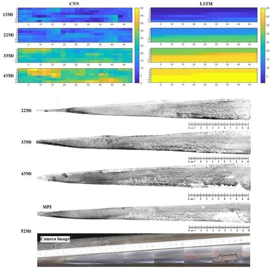 The results are sufficiently general and applicable. The more serious the surface damage of the crossing nose, the higher the predicted value and the brighter the color. Dark blue indicates no dangerous rolling fatigue cracks on the surface of the crossing nose. The color changes from blue to green to yellow as the traffic volume increases. As a sample crossing nose to display, it needs to be replaced at 43 Mt, and the bright yellow warning is in the picture. When it reaches 52 Mt, as shown at the bottom of Figure 11, the surface of the crossing nose has a severe block drop and ultimately fails. Figure 11 also compares the CNN model further with the LSTM. In Figure 9, the calculation results of the CNN and GPR models are similar. In Figure 11, the calculation result of LSTM corresponds to the color change. It is more continuous and smooth. The results of CNN and LSTM are similar, verifying the feasibility of predicting crossing nose failures through crack features. But the results of LSTM are more explicit and can better identify the surface state of the crossing nose at this time. We add the magnetic particle inspection pictures corresponding to the accumulated traffic volume in Figure 11 as a verification. Combined with the evaluation of DB experts, there are a large number of complex structural cracks and surface spalling in the 43 Mt magnetic particle inspection results, and the crossing nose is in an early warning state at this time. However, the LSTM algorithm in this paper passes a sufficient number of yellow blocks, that warn of failures at 33 Mt. Sure enough, at 52 Mt, there were large areas of falling blocks on the surface of the crossing nose, which seriously affected driving safety.