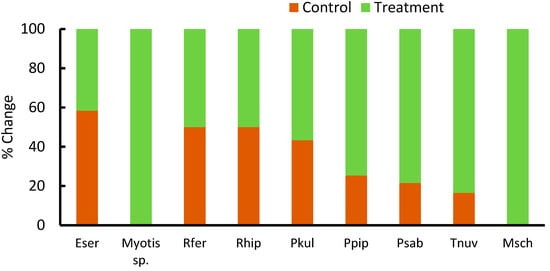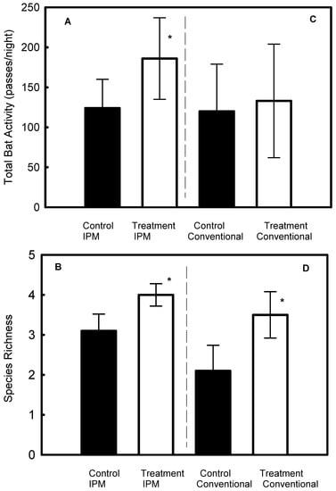 - Wickramasinghe, L.P.; Harris, S.; Jones, G.; Vaughan, N. Bat activity and species richness on organic and conventional farms: Impact of agricultural intensification. J. App. Ecol. 2003, 40, 984–993. [Google Scholar] [CrossRef]