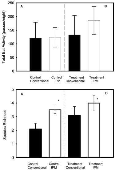 - Brown, V.A.; de Torrez, E.B.; McCracken, G.F. Crop pests eaten by bats in organic pecan orchards. Crop Prot. 2015, 67, 66–71. [Google Scholar] [CrossRef]