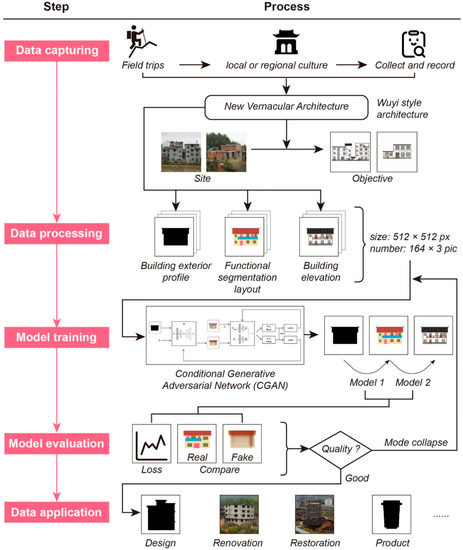This paper uses a method, based on CGANs for the style transfer from the local architectural style to the village and town building facade, to provide the design, decoration, and the restoration of the building facades to the village and town architectural style (Figure 3). This has an important practical value for the unified-style governance of large-scale and multi-building villages and towns. The method of this study consists of five aspects: data collection, data processing, model training, model evaluation, and data application. Please refer to Appendix A for the computer environment of model training.