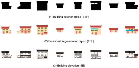(2) Data processing. As a cutting-edge machine learning model, a CGAN has powerful image information processing capabilities and realistic generation effects. However, the training of a CGAN is often accompanied by problems, such as the difficulty in convergence and uncontrollable results [24]. To reduce the training time of the model and to improve the accuracy of the model, we redrew the collected samples into three categories of pictures: building exterior profile (BEP), functional segmentation layout (FSL), and building elevation (BE).