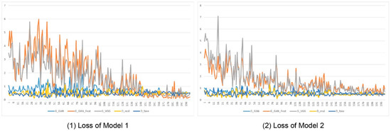 The loss of the generator and discriminator of each generation in the model training process were counted (Figure 6). Model 1 represents the weight model, from the BEP to the FSL. Model 2 represents the weight model from the FSL to the BE. Following 200 generations of training, the loss gradually decreases, and the fluctuation stabilizes in a small range. This shows that the model is basically fitted and the training results are good. The loss fluctuation of Model 2 is smaller than that of Model 1 and the training is basically stable around the 80th generation. However, Model 1 still has significant fluctuations around the 130th generation, indicating that the training from Model 1 is more difficult and more complicated.