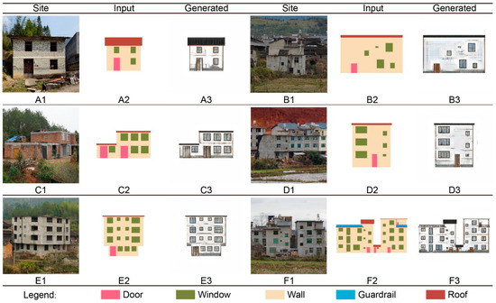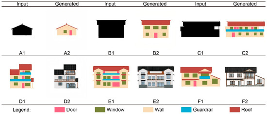 As shown in Figure 11, six main buildings on the site, Figure 11A–F, which lack facade decoration, were selected as examples. According to the openings of the doors and windows on the facade of the existing buildings, the FSL is drawn manually and used as a sample for the BE generation. As a result of the simplicity of the village’s architecture, the CGAN facade has no major advantage over the artificial design. It only takes around one minute to generate the results for the next six examples in large-batch design assignments, demonstrating its efficiency advantage. Additionally, due to the influence of the existing building facade form and elements, if it is generated completely, according to the status quo, the final effect is relatively common. Only turning the walls white and adding a small amount of facade decoration cannot fully reflect the regional style. In practical applications, in addition to directly generating the existing facades, it can be further artificially optimized, to add more facade decorations to strengthen the embodiment of the regional styles with respect to the economic considerations.