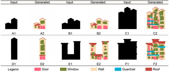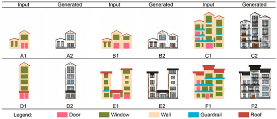 We randomly selected 20% of the images (99 images) from all images (492 images) in the training set, as the test set to test the trained model. As shown in Figure 8, buildings A to C are the test results of Model 1, and buildings D to F are the test results of Model 2. The generated results are relatively accurate, and the ideal results can be perfectly predicted with small errors. In Model 2, the generated results can not only generate doors, windows, railings, roofs, and other components according to the functional division of the FSL, but it is also possible to additionally generate facade styles and decorative lines, reflecting the local style of the building.