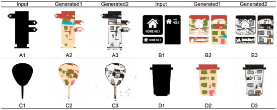 (2) Automatically adjusting the style of the door. In Figure 10A2,B2, it can also be seen that the machine generates single and double doors, according to the different dimensions of the door. The materials of the doors, generated by Figure 10B2,C2, are also significantly different. Figure 10B2 is a grid door, and Figure 10C2 is a wooden door.