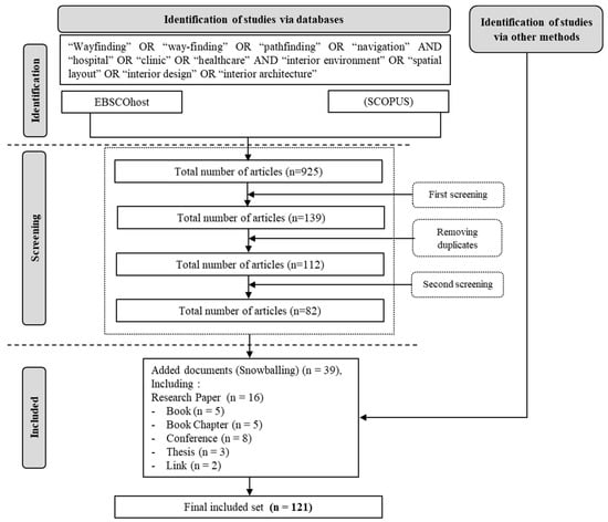 This study incorporates a set of keywords to investigate wayfinding in complex healthcare settings. The set of keywords (“wayfinding” OR “way-finding” OR “pathfinding” OR “navigation” AND “hospital” OR “clinic” OR “healthcare” AND “interior environment” OR “spatial layout” OR “interior design” OR “interior architecture”) was used to collect the available research on wayfinding in healthcare facilities and its implications on human wayfinding performance. Two search engines were utilized to acquire the research articles: the first was Scopus, while the second was four data bases of EBSCOhost, namely Academic Search Elite, Art & Architecture Complete, E-Journals, and Psychology and Behavioral Sciences Collection.