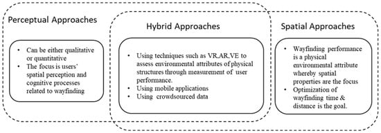 This taxonomy of approaches is consistent with the one proposed by [,]; although it was not wayfinding-specific, the principles of human-environmental interaction are similar.