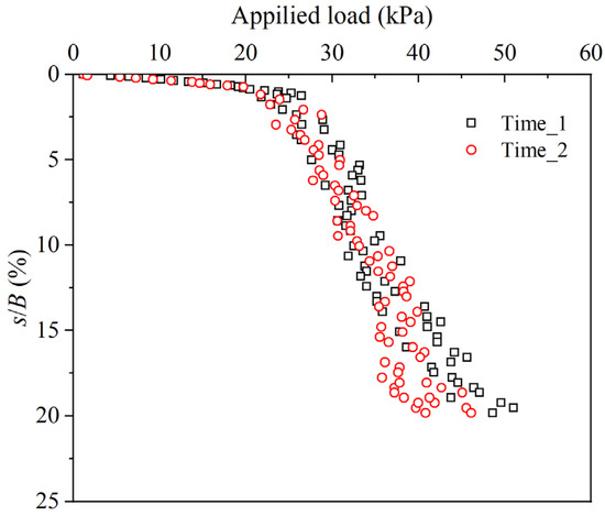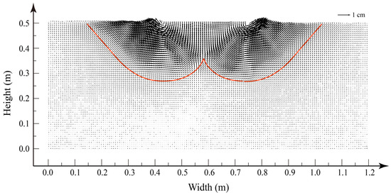 Figure 3 shows a plot of the applied load versus the settlement ratio (s/B) obtained from the tests on the unreinforced foundation. The load–settlement curves obtained from two separate tests were nearly identical, indicating the repeatability of the test system. The point at which the load–settlement relationship changed its inclination was defined as the bearing capacity of the foundation. The ultimate bearing-capacity value for strip footing, according to Terzaghi, was calculated as qu = 25.9 kPa, using the formula qu = 0.5γBNγ [30]. The ultimate bearing-capacity value obtained from the test results (Figure 3) was close to the calculated value, indicating that the tests on the unreinforced foundation yielded true results. The cumulative displacement distributions of the soil particles without geosynthetics under an applied load of 25.9 kPa are plotted in Figure 4. A general shear failure mode that occurred in the soil specimen was similar to that of the DEM modeling results reported by Fu et al. [31]. This verified the reliability of the test system.