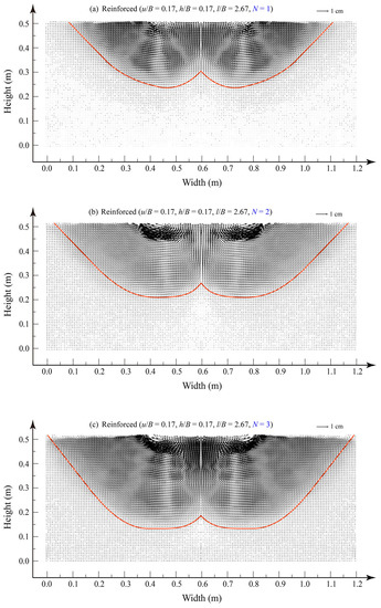 Generally, the bearing capacity of a foundation is enhanced by geosynthetics and increases with the number of reinforcement layers. Similar results were also obtained in this study (Figure 5). The ultimate bearing load of the reinforced foundation increased from 32.3 to 35.6 kPa as the layer number N increased from 1 to 2 and until 60.9 kPa, when N = 3. To analyze this result, the cumulative displacement distributions of soil particles in the reinforced foundations with different geosynthetic-layer numbers were investigated as the load approached the ultimate bearing load, as shown in Figure 6. The movement law of the aluminum rods in the reinforced foundation was the same as that in the unreinforced foundation; however, the displacement increased. To compare the displacement differences of the reinforced and unreinforced foundations, red lines were drawn where the displacement of the aluminum rods was equal to 1 mm, which is regarded as the failure surface of the foundation. Because of the pressure transfer behavior from the soil to the geogrids, the sliding wedges in the reinforced cases (N = 1, 2, and 3) were significantly larger than those in the case of N = 0 (see Figure 4 and Figure 6). This resulted in an ultimate reinforced foundation-bearing load significantly larger than that of the unreinforced foundation. In other words, geosynthetics increased the size of the sliding wedge, and more force was required to push the wedge. Because the size of the sliding wedge in the N = 2 reinforced case was slightly greater, its ultimate bearing pressure was slightly greater. In the N = 3 reinforced case, the size of the sliding wedge was far greater than that of the N = 1 reinforced case, and the ultimate bearing pressure was far greater. It can be concluded that the micro mechanism of the increasing bearing capacity of the reinforced foundation caused by the increased number of geosynthetics is the increase in the size of the sliding wedge in the foundation.