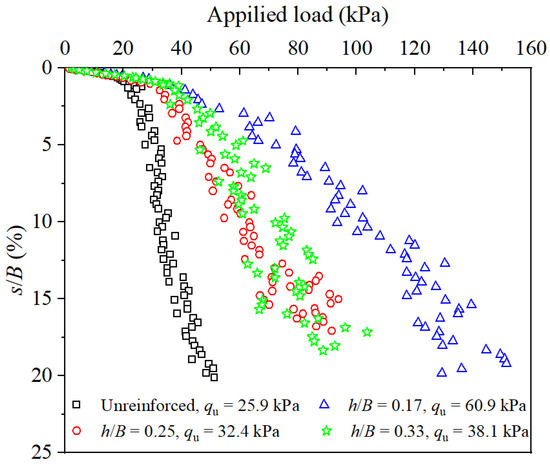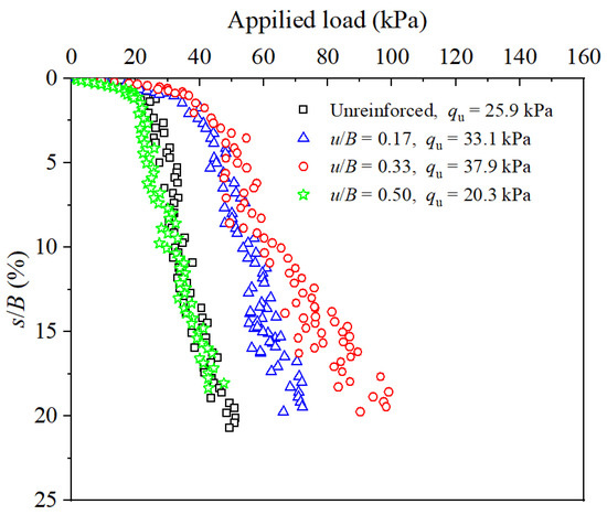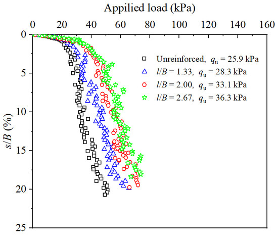 Shahin et al. [17] studied the effect of reinforcement length l on the bearing capacity of reinforced foundations. They stated that a significant increase in the bearing capacity could be achieved if the geosynthetics were placed at an optimum length, and no significant change in the bearing capacity occurred when the reinforcement length was l/B > 2. In this study, the ultimate bearing load of the reinforced foundation increased from 28.3 to 33.1 kPa as l increased from 40 to 60 cm and increased to 36.3 kPa when l = 80 cm, as shown in Figure 7. Owing to model size limitations, tests on reinforced foundations with longer geosynthetics were not carried out.