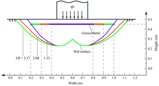 Figure 8 shows the sliding wedge of the foundation reinforced with geosynthetics of different lengths. With an increase in the length of the geosynthetics, the width of the sliding wedge increased, but the depth remained substantially unchanged. This is because the increase in the length of geosynthetics can only transfer the force to a wider range, not to a deeper range. Still, the ultimate bearing load increases with the increase in the sliding width. Because the increment of sliding width as l increases from 40 cm to 60 cm is greater than that from 60 cm to 80 cm, the increment of ultimate bearing load decreases from 4.8 kPa to 3.2 kPa.