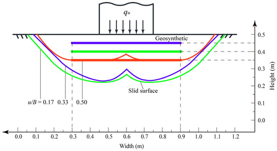The sliding wedge and load–settlement curves for the model tests with one layer of reinforcement placed in different spaces are presented in Figure 9 and Figure 10, respectively. When the top-layer spacing was relatively small (u/B = 0.17 and 0.33), a sliding wedge occurred in the unreinforced zone (purple and green lines). However, when the top layer spacing increased to 15 cm, the sliding surface slid directly along the contact surface between the geosynthetics and the soil, and a sliding wedge occurred in the reinforced zone (red lines). Because the size of the sliding wedge increased, the ultimate bearing load increased from 33.1 to 37.9 kPa as u/B increased from 0.17 to 0.33. Whereas the ultimate bearing load decreased to 20.3 kPa (even less than that of the unreinforced foundation) when u/B increased to 0.50 as the result of the decrease in the size of the sliding wedge. This finding was similar to that reported by Shin et al. [32] It has been noted that the friction at the soil–reinforcement interface in 3D model tests may be larger than that in 2D model tests; thus, the ultimate bearing load in the 3D model tests may increase even if the size of the sliding wedge decreases.
