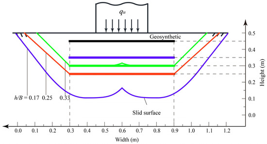 Figure 11 and Figure 12 show the sliding wedge and load–settlement curves for the model tests with three layers of reinforcement placed at different vertical spacings. When the vertical spacing was relatively small (h/B = 0.17), a sliding wedge occurred in the unreinforced zone (purple line); however, the sliding wedge also occurred in the reinforced zone with h/B = 0.25 and 0.33 because the sliding surface slid directly along the contact surface between geosynthetic and soil. Because the size of the sliding wedge decreased as h/B increased from 0.17 to 0.25, the ultimate bearing load decreased from 60.9 to 32.4 kPa, whereas it increased from 32.4 to 38.1 kPa as h/B increased from 0.25 to 0.33.