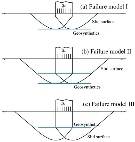 Based on the above 2D model test results, three possible failure modes are summarized for reinforced soil foundations as illustrated in Figure 13: failure above the top reinforcement layer, failure between reinforcement layers, and failure similar to footings on the unreinforced foundation. The first two failure modes should be avoided in engineering practice to fully exploit the reinforcement effect of geosynthetics. Abu-Farsakh et al. [33] conducted experimental studies and claimed that the first two failure modes can be avoided when the top layer spacing and vertical spacing are less than 0.5 B. Because 2D model tests were carried out in this study, the value of 0.5 B was not applicable here.