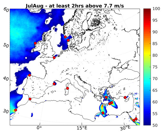The wind conditions summary for several representative selected locations and a 7 m/s threshold is shown in Table 1. The table lists the maximum monthly values in a sample with a maximum of three grid points (approx 18 km) offset for each exact location. This takes into account the discrepancy between the model and in situ topography and the fact that the coastline best suited for different windsports at different wind directions might be somewhat distant from the chosen primary location. The listed locations are shown in Figure 1. They were selected as representative locations in regions that were identified as windsport-favorable in our study and these will be the focal points of our further analysis. We have chosen well-known windsport spots (Sidi Kaouki, Tarifa, Klitmoller, etc.) where possible. There are also several areas that are less known even to windsport enthusiasts, such as Anamur, the Gulf of Bomba, and Cadaques.