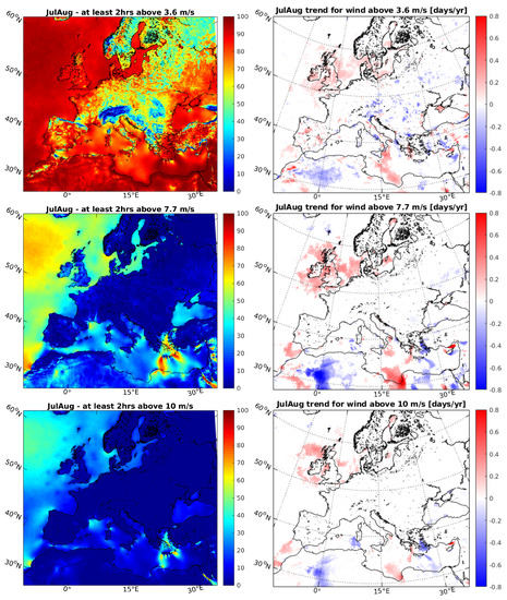 Left: Average percentage of days with at least 2 h of wind above the threshold value during daytime for July and August. Right: Trend of days fitting the same criteria—only statistically significant values are shown (right).