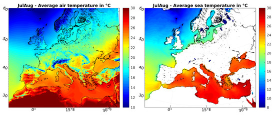Average air temperature (left) and sea surface temperature (right) for the July and August period.