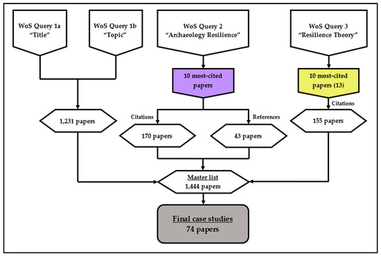 The first step was to search directly for relevant papers by title (Search Query 1a) and topic (Search Query 1b), using the terms “resilien *”, “sustainab *” and “archaeology *” (and “archeolog *” to accommodate American English). Topic searches provide articles that use the terms in their title, abstract and keywords. In WoS, an asterisk (*) is a wildcard that can represent any group of characters; it was utilized in these searches to enable any variant of the above words (e.g., resilience and resilient).