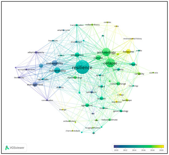 The highest occurring keywords include the search terms of resilience (36), archaeology (18), and sustainability (15), as well as related terms such as collapse (20) and vulnerability (13). Additionally, climate and adaptation appear frequently but with multiple variations: 33 counts of climate, climate change or climate-change; 17 counts of adaptation, adaptive capacity, or adaptive cycles. The map also reveals keyword changes over time, with sustainability and related terms (e.g., biodiversity, management, adaptive capacity) averaging older publication dates; the associated graph shows that sustainability was a keyword in only six papers in the last five years (12.2%) compared to eighteen uses of resilience (36.7%). Keyword occurrences over time can also be seen in Figure 4. Terms relating to climate have seen more frequent use in recent years as well, with the first use in 2007 and are featured in 46.9% of papers published in the last five years. Overall, more recent keywords relate to specific types of archaeological analysis/evidence (e.g., charcoal analysis, archaeobotany), variables impacted by stressors (e.g., agriculture, land-use, landscape), or study periods (e.g., iron-age, ice-age, Holocene). Keywords featuring in older papers are more frequently ecological terms (e.g., sustainability, biodiversity, management, adaptive capacity), their older average dates are partially the result of the key theory papers, which are largely from the field of ecology.