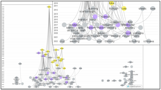 The remaining eight clusters (i.e., those containing multiple papers) are numbered by author count. Cluster 1 is the largest cluster and contains six papers discussing resilience in case studies across Eurasia, with a total of 88 authors. The lefthand side of this cluster is comprised of two papers with a high number of co-authors discussing prehistoric resilience during the last glacial [87] and early Holocene [61]; the other side of the cluster contains four papers discussing agricultural and using radiocarbon dates [36,51,67,82]. Cluster 2 links together four papers from 24 authors. Three of these papers discuss resilient/sustainable land-use in pre-Columbian Amazonia [37,46,90] whilst the last is focused on Mayan resource management in Belize [28]. Cluster 3 is comprised of six papers authored by members of the Climate Change and History Research Institute (CCHRI), Princeton University, and colleagues (22 authors). Two of these are key archaeological theory/summary papers [21,22]. This interdisciplinary group focuses on the impact of ancient climate change, which these papers discuss for the Neolithic period in SW Asia [72,74] and the Late Antique Eastern Mediterranean [73,91]. Many other key papers relating to historical climate change impacts have been published by this group, with a focus on collaboration between paleo-scientists and archaeologists/historians, especially relating to the Byzantine Empire [114]. Cluster 4 is centred around three papers by Carla Lancelotti [29,63,68], with 19 total authors. These papers focus on human-environment dynamics using archaeobotanical remains and how this relates to human resilience. Lancelotti has also published an important archaeological theory paper that provides a framework indicating key variables for resilience in small-scale societies [115]. This paper was the 11th top-cited paper in WoS Query 2 and is discussed further below. Cluster 5 is the largest in terms of papers, with 11 by 19 authors. This cluster encompasses many of the key literature datasets, with three of the archaeological theory papers by Charles Redman [14,15,16] and seven of the theory papers [1,4,6,7,8,9,10]. One additional paper is included here that has Redman as a co-author [56]. Redman and Holling are the only two authors in this dataset to have four papers included, this is visualized by the size of their node in Figure 2. Cluster 6, similarly to cluster 4, is centred around three papers by one author, Nicholas Dunning [59,85,88], with 13 total authors. These papers discuss both resilience and sustainability, as well as collapse, for the ancient Maya in the Yucatán Peninsula. Two of the papers are specific to the city of Tikal, Guatemala, whilst the other is a comparison of sites across the Maya lowlands. One paper from Cluster 2 [28] could arguably have been included here if they were manually sorted by theme. Cluster 7 is comprised of five authors, with two publications summarizing water technologies and changing climatic conditions on Crete [76,84]. Cluster 8 is another centred around three papers sharing one author, Erika Weiberg [32,62,70], and three total authors, colleagues from Uppsala University. The Peloponnese, and Aegean region more broadly, are the focus in these papers. Weiberg and colleagues have written extensively about climate-society interactions in the Eastern Mediterranean, including detailed sophisticated analyses of resilience and persistence [116,117].