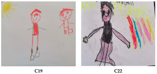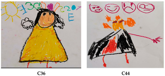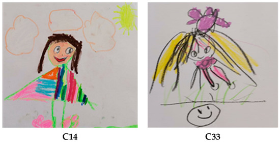 According to Table 3, the children’s answers to the question “How might your imaginary company be feeling?” were grouped into two categories. When the expression distributions related to the question were examined, it was seen that f = 38 (61.29%) answered in the “Happiness” category, and f = 24 (38.70%) answered in the “Unhappiness” category. Below are the expressions of the children and examples of pictures. These expressions and picture examples are as follows (Figure 3).