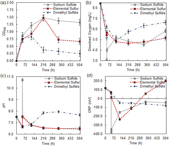Growth conditions of M. sulfidovorans with three sulfur substrates. (a) optical density; (b) D.O.; (c) pH; and (d) oxidation reduction potential vs. staurated Ag/AgCl.