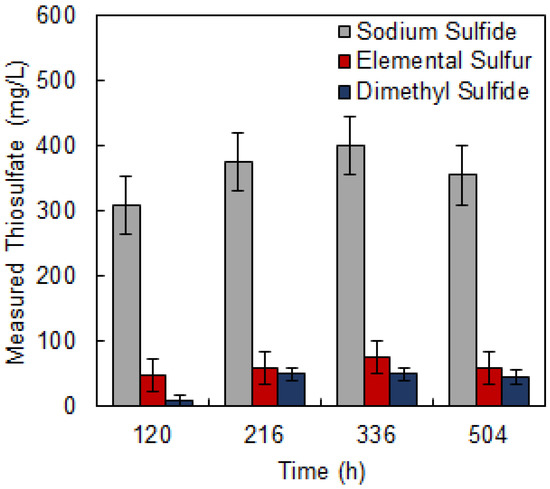 Dimethyl sulfide grown cultures were the lowest in terms of Bio-TS concentrations measured after 7 days, with DMS concentrations above 300 mg/L (4.8 mmol/L) producing negligible cell growth. This toxicity to the bacterium considered in conjunction with the high vapor pressure make it the least ideal substrate from the perspective of biogenic thiosulfate production. The phenomenon may be of interest to industries where DMS is produced in industrial activities and must be captured and remediated, such as pulp and paper [33]. It is also regarded as a significant chemical in the atmospheric sulfur cycle affecting climate, ecology, and global temperatures so the processing by marine bacteria may be significant to research in other fields [34].