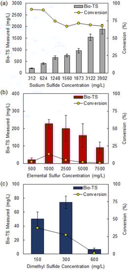 Bio-TS production and conversion (%) at different concentrations of (a) Na2S; (b) S0; and (c) DMS.