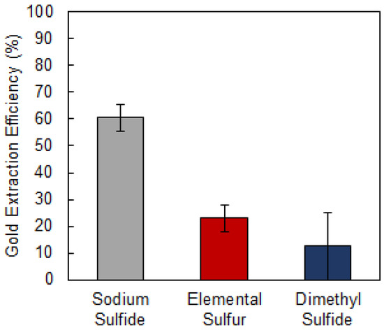 The same trend was realized with oxide ore leaching experiments as that of gold powder leaching. Bio-TS produced using Na2S had the largest concentration and the highest gold leaching, Figure 6, with an average of 60.5% gold extraction efficiency. Thiosulfate consumption was higher at the lower concentrations as well, where it increased on average from 42.5, 43.5, to 96.5% in leaching experiments with Bio-TS from Na2S, S0, and DMS grown cultures, respectively.