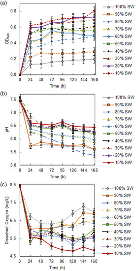 Figure 7 shows the results of these growth experiments over the first 168 h of growth. There were very minute differences in growth rate and cell concentration of the cultures until the seawater content exceeded 70% of the solution volume. This was also confirmed by a lower D.O. consumption in cultures of 70% seawater and higher, indicating the bacteria consumed less oxygen for growth on methanol. Above 70% seawater the cultures grew slower and reached lower final cell concentration, while also increasing in pH to lower levels than others. This is likely due to the decrease in sodium carbonate from the DSMZ 951 fractions, which slightly buffers the pH as the growth progressed in lower seawater fraction cultures. It was concluded that up to 70% seawater could be mixed with the bacterial medium without large impact on growth.