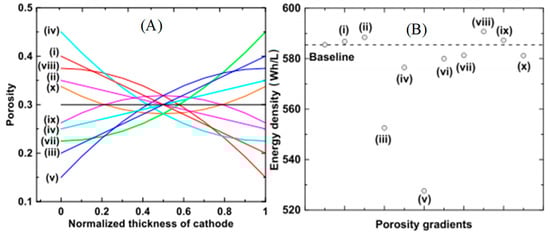 Figure 3A indicates four linear (i–iv) and six second-polynomial (v–x) variations of the porosity gradient. Figure 3B shows the energy density relation with the porosity gradient. Four gradients have higher energy density than the baseline, but the improvement is insignificant. However, a poorly designed porosity gradient can be responsible for decreasing the energy density, as shown by the porosity gradient (v) due to worse electrolyte depletion [98]. It should be noted that the Bruggeman relation estimates the Li-ion diffusion length. The Bruggeman relation assumes that the insulating phase has a low volume percentage represented by random and isotropic spheres. This relation may be invalid for the real electrode structure which has more complexity, and the real cell performance might differ from the results found with simulation [99].