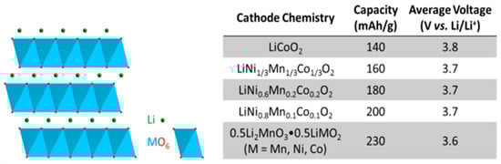 Cathode materials must also satisfy stability, including thermal and electrochemical, sensible cost, sufficient conductivity, and other design criteria. Sony introduced the first commercial LIB in 1991, in which LiCoO2 was used as the active material of the cathode. LiCoO2 is limited to an amount of 140 mAh/g of reversible capacity [114,115], but an improved capacity of layered oxides could be achieved by partial substitution of Co using different metal ions (Figure 4) [116,117]. In particular, NMC cathodes that have high nickel contents (LiNixMnyCo1−x−yO2 where x > 0.6) with reversible capacities >200 mAh/g have shown affirmative results for increasing the energy density in Li-ion cells and are replacing lower capacity chemistries for the next generation EVs [118]. However, several critical challenges with Ni-rich NMCs need to be addressed. To achieve a cell level energy density >250 Whkg−1, high voltage cycling (>4.4 V) is required, in spite of the NMC cathode being coupled with an advanced anode made of silicon-graphite composites [119]. Impedance rises and capacity loss have been reported to occur due to high voltage cycling [120]. An increase in impedance has been partly imposed on a rock-salt surface reconstruction layer due to the loss of oxygen and reduced oxidation states of transition metals [121]. High voltage cycling has also been shown to be responsible for decomposing current generation electrolytes and forming a surface reaction layer [118,119]. In particular, Ni 4+ ion in contact with electrolyte has been shown to be unstable [118,122].