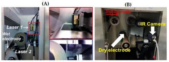 Electrode coating control: (A) Laser caliper setup for measuring coating thickness; (B) IR thermography for measuring coating defect in line. Adapted with permission from ref. [94] (Jianlin Li et al., 2017).