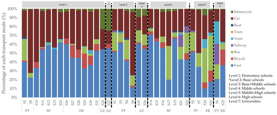 Schools that have basic and middle joint levels (identified as level 2 in Figure 2) are located only in Portugal. Comparing their results with elementary Portuguese schools, it is possible to identify an increase of around 10% regarding the choice of walking as their transport mode with the upgrade in educational level. This fact can be related to the age of the students, along with the distance from home to school. An exception is school S9, where 71% indicated travel by car as their main transport mode and only 12% by walking.